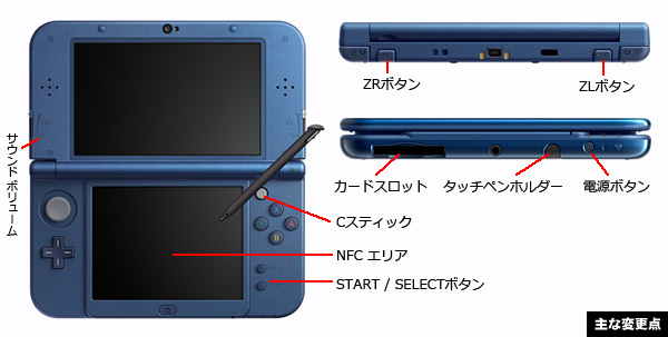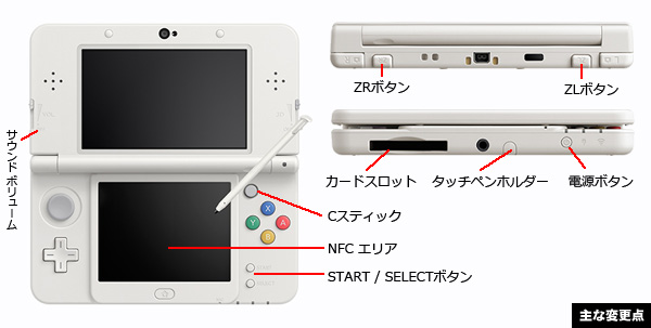 そのほか、CPUの性能向上、画面の明るさ自動調整(バッテリーの持続時間アップ)、記録媒体をマイクロSDカードに変更、インターネットの動画再生に対応、カメラの性能アップ、無線LANによるPCへのデータ移動、NFC機能(amiibo対応ソフト使用可)などに対応。