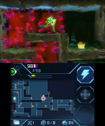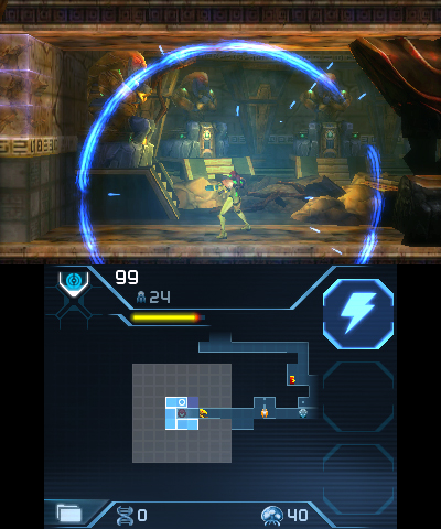 - 1992年にゲームボーイで発売された横スクロールアクション「メトロイドII RETURN OF SAMUS」のフルリメイク。バウンティハンターのサムス・アランが迷路のような惑星SR-388を探索し、危険な浮遊生命体メトロイドの殲滅を目指す。新たなアクションや能力が多数登場。従来の8方向固定から、360度全方位の「フリーエイム」射撃が可能となった。これまでは回避するしかなかった敵の攻撃も、「メレーカウンター」で切り返して強力な反撃を叩き込める。一時的にパワーアップできる「エイオンアビリティ」には、セミオート連射機能と劇的なビーム強化をもたらす「ビームバースト」や、全身を帯電させて敵を寄せ付けない「ライトニングアーマー」など、さまざまな種類がある。amiiboは同日発売の2体に加え、「スマブラ」のサムス、ゼロスーツサムスに対応。