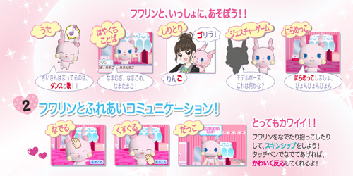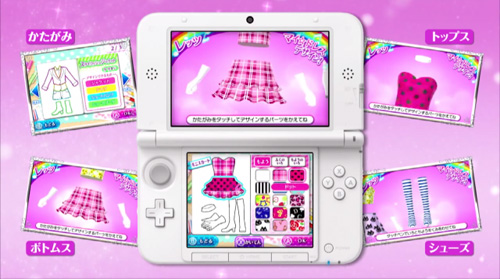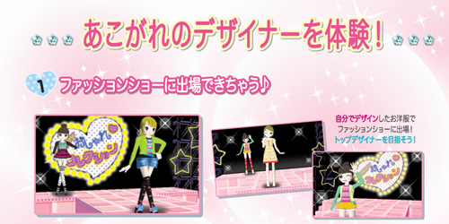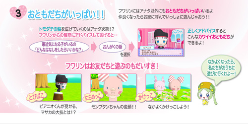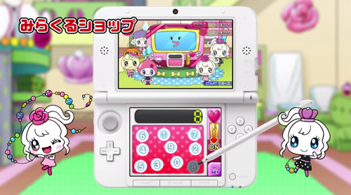 - 本格的なスイーツ作りを体験できる、お菓子屋さんゲーム。ケーキやタルトといった洋菓子のほか、ようかんやアイスクリームなど、合計100種類以上ものスイーツ作りを楽しめる。スイーツを作る過程はミニゲーム仕立てになっており、「分量を量る」「ふるいに掛ける」「卵を割り入れる」といった作業をタッチペンの直感的な操作で行なう。店に買い物にきたお客さんが作ったスイーツを喜んでくれると、新しいレシピがもらえて、それまでは作れなかった種類のスイーツが作れるように。新しいレシピをもらうときに必要な「あいことば」は、友だち同士のあいだでやり取りすることが可能。そのほか、商店街でかわいい雑貨をショッピングしたり、美容室でヘアスタイルを変えたり、公園で店の先輩と遊んだりと、スイーツ作り以外の女の子の生活も味わえる。
