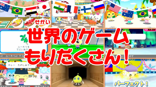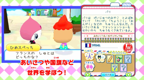 - 「たまごっち」と世界中を旅行するワクワク体験ゲーム。たまごっち星にできた地球の世界にそっくりな10ヶ国を訪れて、それぞれの国にいるたまごっちたちと仲良くなろう。たまごっちとの会話で発生する「クエスト」や「ミニゲーム」をクリアすると「ご当地アイテム」をはじめ、いろんなアイテムがもらえる。ミニゲームはロシアではフィギュアスケート、ブラジルではサッカーと、各国ならではの遊びが用意されているぞ。アイテムを集めたら「セレクトショップ」に並べて、ポイントを稼いで次の国へ旅立とう。アイテムは「マイルーム」の模様替えができるインテリア、マイキャラアバターを着替えさせられる世界の民族衣装など種類はさまざま。首都や国旗など、各国に関する知識をコレクションできる「スクラップブック」も楽しめる。