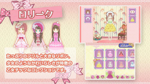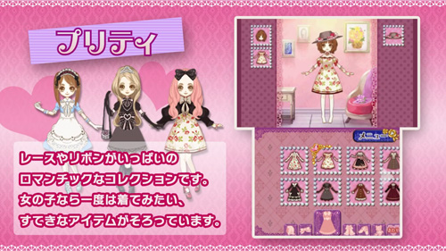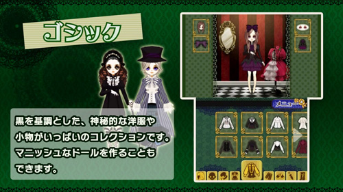 - ファッションドールをモチーフにした「ドール」をコーディネイトできる、ドレスアップドール&デコレーションソフト。本作は、ニンテンドーDSiWareで配信されたシリーズ5作品のアイテムをすべて収録し、各作品特有のコーデを楽しめる仕様となった。好みの髪型やドレス、アクセサリーなどを選んでドールを着せ替えし、自分だけのドールを作ろう。ドールは壁紙やフレーム、ジュエルシールやらくがきペンでデコレーションしたり、カメラで写真撮影することも可能だ。それをSDカードに保存し、友だちと交換・プリントアウトすることもできる。ファッションは「オリジナル」「ロリータ」「プリンセス」「アンティーク」「ゴシック」の5種類あり、ゴージャスなドレスやパンツルックなど、コーデの組み合わせは無限大。
