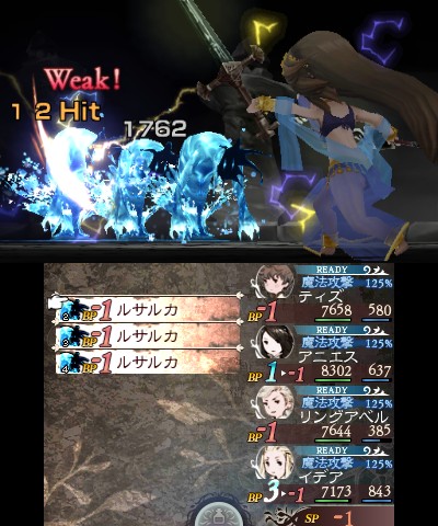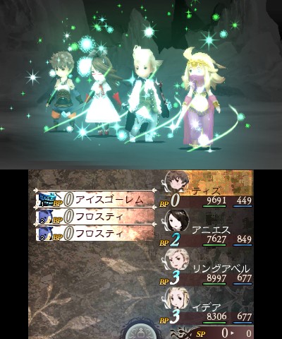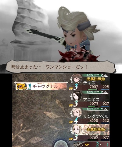 - FF外伝「光の4戦士」のスタッフが贈る正統派ファンタジーRPG「ブレイブリーデフォルト」の数年後を描いた作品。闇から世界を救い、クリスタル正教の法王となった前作ヒロインのアニエスだが、突如現れた仮面の男、皇帝オブリビオンに連れ去られてしまう。プレイヤーは正教騎士団三銃士の若きリーダー、ユウ・ゼネオルシアとなり、法王奪還と打倒皇帝を目指して戦う。戦闘はターン制のコマンドバトル。防御でためたBP(ブレイブポイント)を消費して1ターンの行動回数を増やしたり、3DSをスリープさせて蓄積したSPを消費して時を止め、ダメージ9999を超える攻撃を一方的に加えたりできる。本作では通常プレイ時にもSPがたまるほか、敵を1ターンで倒すと「連続チャンス」が発生し、連戦するほど報酬がアップする。キャラクターはジョブチェンジと、覚えたアビリティを自由に組み合わせることが可能だ。パティシエ、ねこ使いなどユニークな新ジョブも登場。
